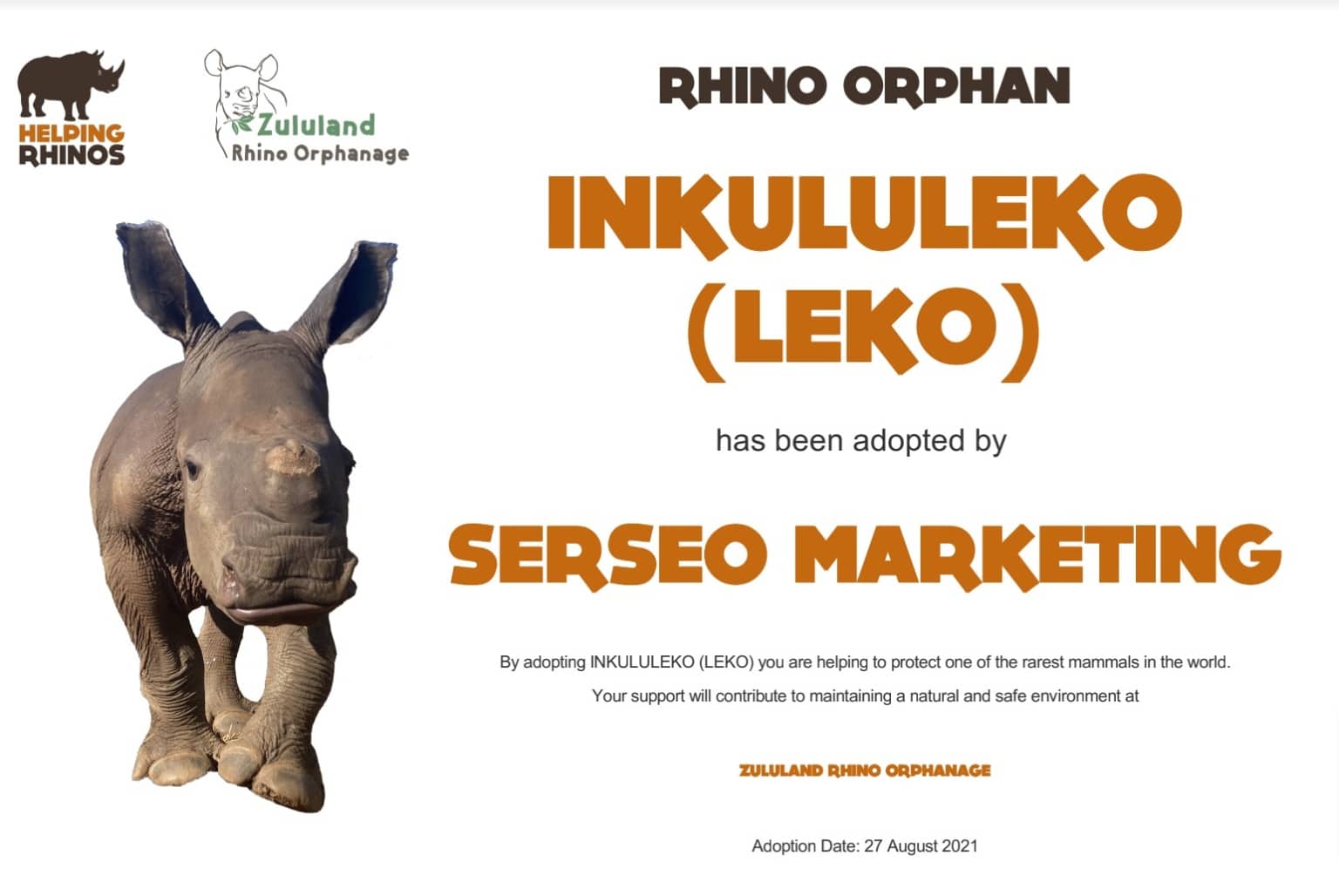Leko es un bebe de rinoceronte blanco a quien su madre no podía dar leche debido a terribles heridas y diversos problemas. Inkululeko significa “libertad” en el lenguaje Zulú y fue recogido en abril del 2021 por el orfanato de rinocerontes de Zululand Rhino Orphanage